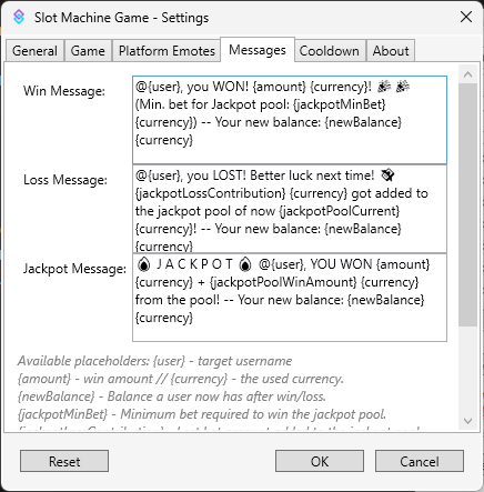 - Win/Loss/Jackpot messages are now editable in the Messages tab.
