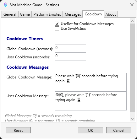 - Cooldown tab handles everything needed to set cooldowns for the command and cooldown messages.
