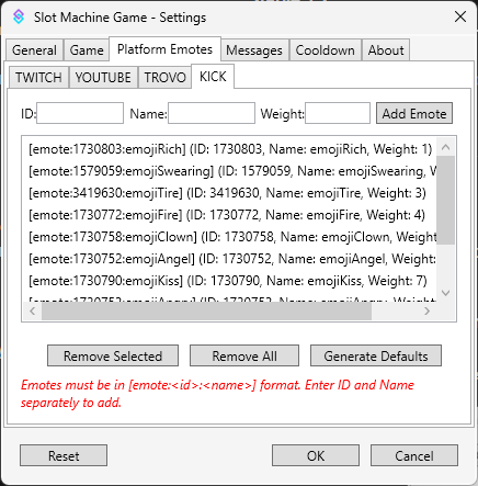 - Emote pool is randomized! When you pick or reset your emote list, each one randomly gets a different chance to appear. Editing the emote list won’t change the luck of ones already added.