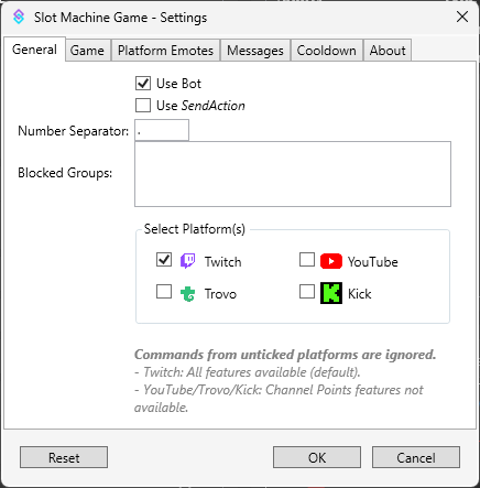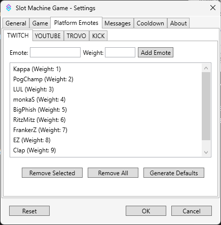 tab, so you can now control exactly the chance of a emote match (normal win), the jackpot and how many reroll attempts should happen. - Each platform now has their own jackpot pool.