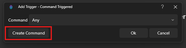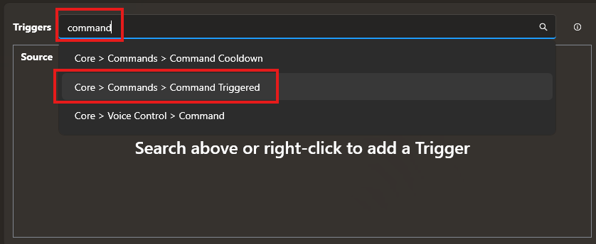 - You can add the command trigger first by righ-click > Core > Commands > Command Triggered or just search for it in the search box: