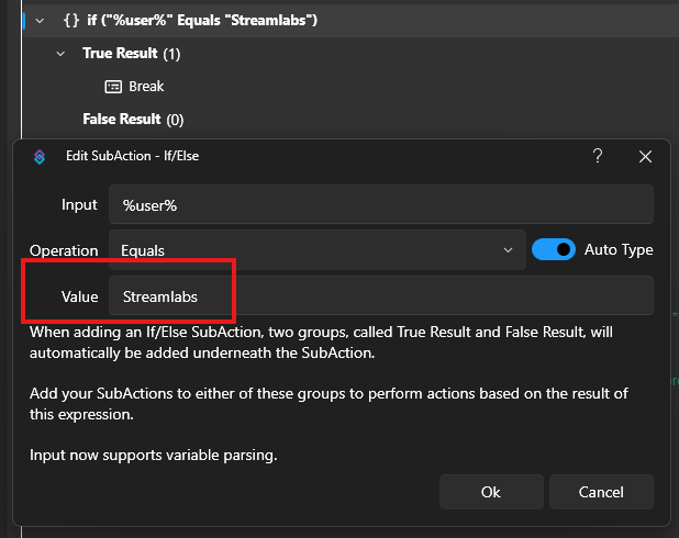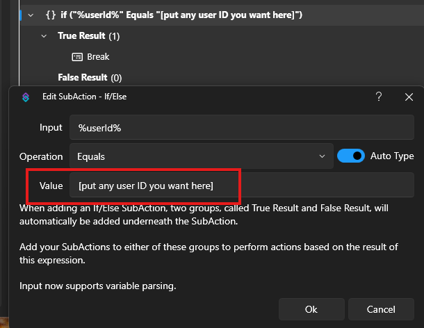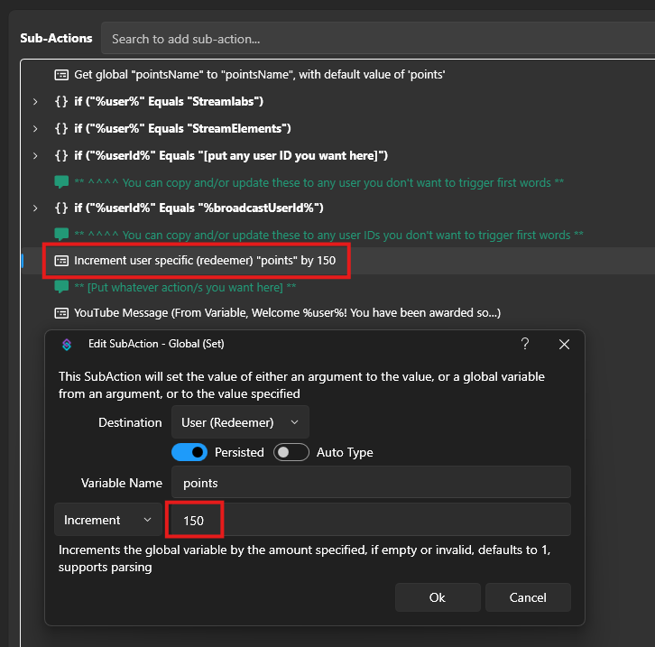 Update/Add any user IDs that you don’t want triggering the “First Words” event. You can right-click and duplicate sub-action to add more.