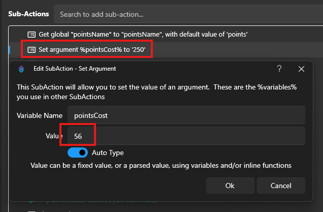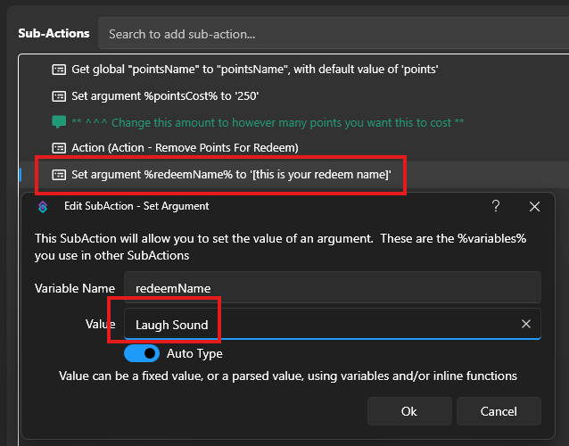 - Update [this is your redeem name] in the “Set argument %redeemName%…” sub-action
